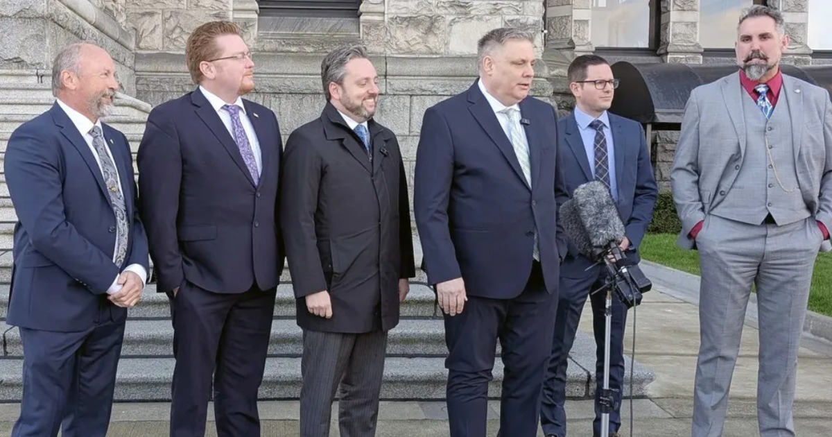 Peter Milobar, the MLA for Kamloops Centre, stood on the front steps of the legislature on Wednesday flanked by caucus colleagues Brennan Day (Courtenay-Comox), Gavin Dew (Kelowna-Mission), Kiel Giddens (Prince George-Mackenzie), Scott McInnis (Columbia River-Revelstoke) and Ward Stamer (Kamloops-North Thompson).